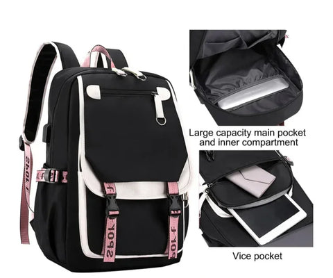 The built-in USB charging port enables easy device charging on the go (power bank not included). With dedicated laptop compartment, multiple organizer pockets, and comfortable padded straps, it's ideal for school, college, or daily use. Whether you're heading to class, commuting, or out with friends, this bag has you covered in fashion and tech.