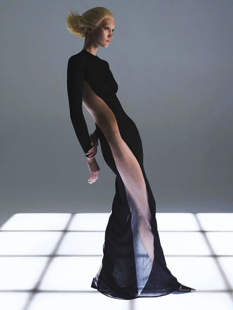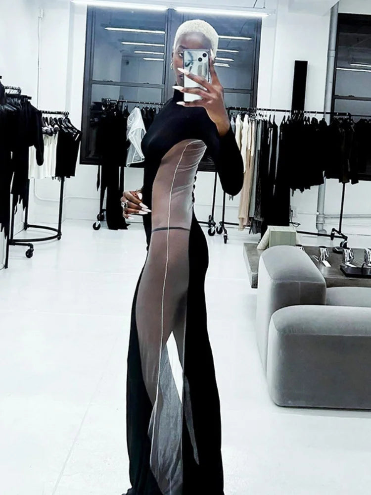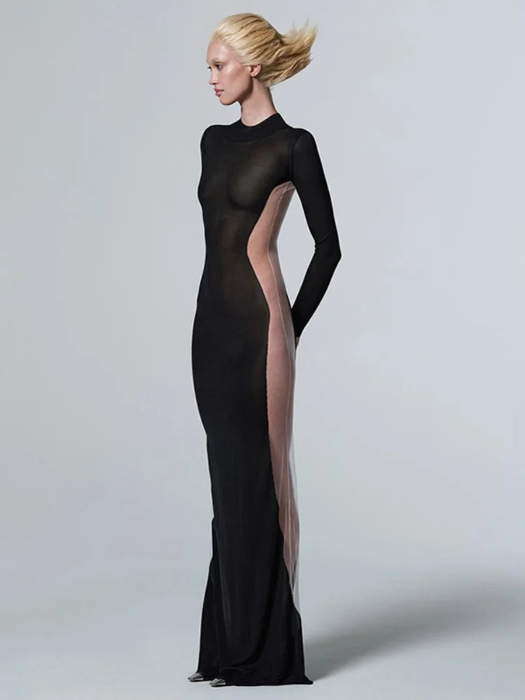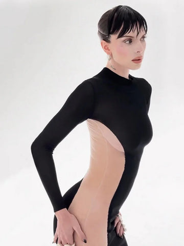 Classic black mesh tube dress with sheer detailing. A versatile piece you can layer or wear bold.
