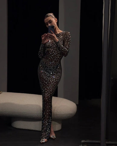 Crafted from soft, lightweight transparent mesh, this gown features a floor-length silhouette that contours the body while catching the light with every move. The all-over micro-glitter finish and subtle metallic reflections recreate that iconic “chainmail” effect that dominated recent celebrity looks from Sydney Sweeney, Kate Hudson, and Nicole Scherzinger.